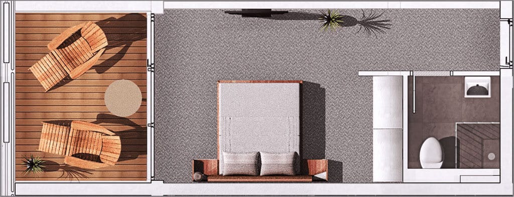 1 Schlafzimmer mit Kingsize-Bett. 1 Badezimmer mit WC und Dusche. Klimaanlage. Balkon mit Sonnenliegen.