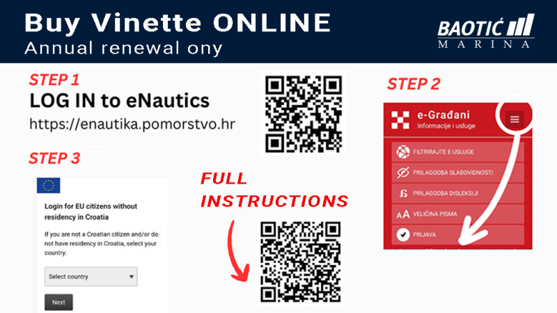 Beim Einlaufen in die inneren Seegewässer und das Hoheitsmeer der Republik Kroatien ist der Kapitän des Schiffes verpflichtet, auf dem kürzesten Weg den nächstgelegenen für den internationalen Verkehr geöffneten Hafen anzulaufen, um die Grenzkontrolle durchzuführen und eine Vignette beim Hafenamt oder einer seiner Zweigstellen zu erhalten.