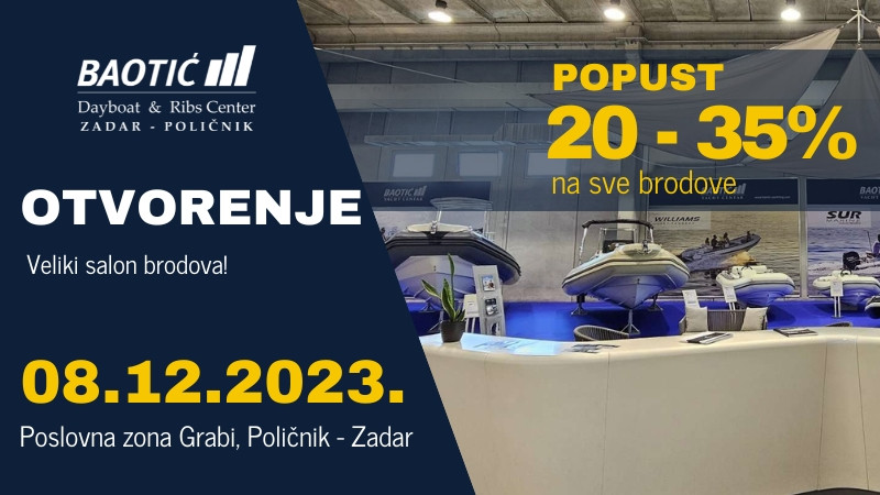 Otvoramo svoja vrata 8.prosinca 2023., a kako bismo podijelili radost s Vama, nudimo ekskluzivan popust od 20 do 30 posto na sve brodove koji su trenutno na stanju. Ovo je prilika koju ne želite propustiti!