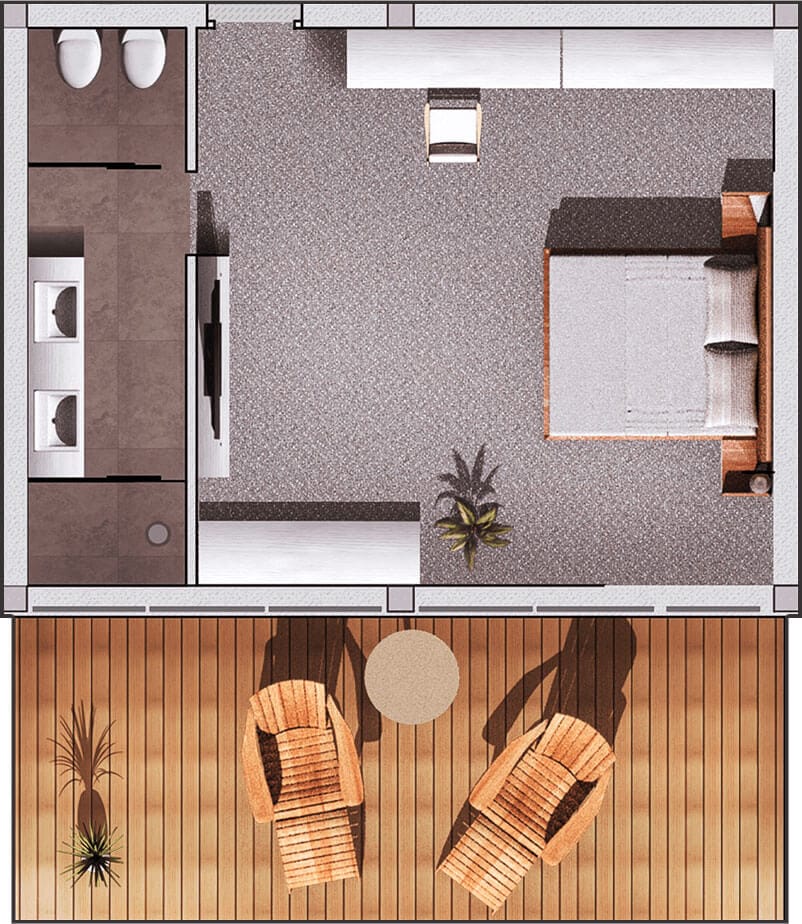 1 Schlafzimmer mit Kingsize-Bett und ausziehbarer Couch. 1 Badezimmer mit WC und Dusche. Klimaanlage. Balkon mit Sonnenliegen.