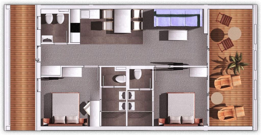 2 bedrooms with King Size bed. 2 bathrooms with toilet and shower. Kitchen with dining area. Living room with extenable couch. Air condition. Balcony with sunbeds.