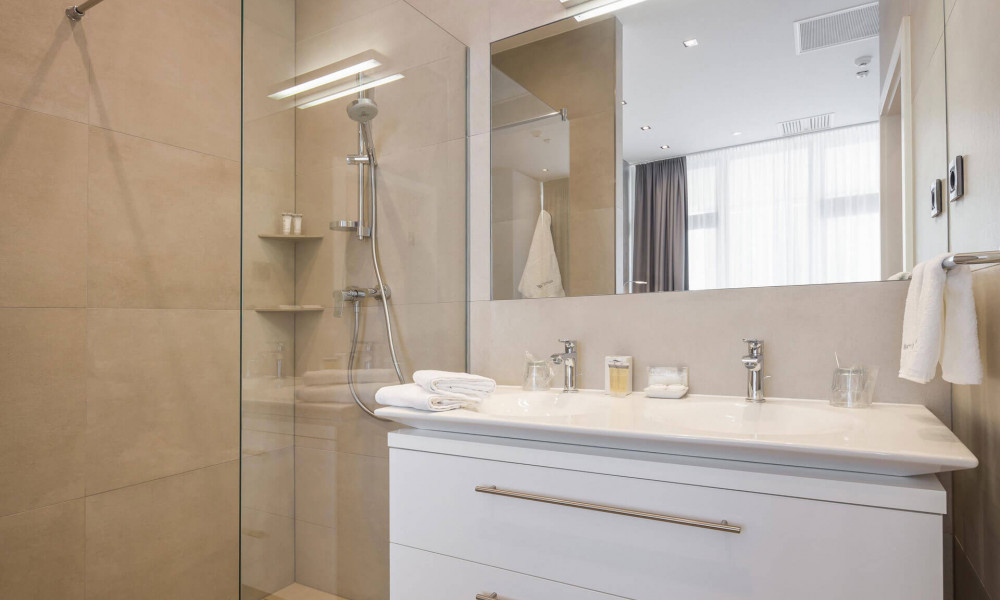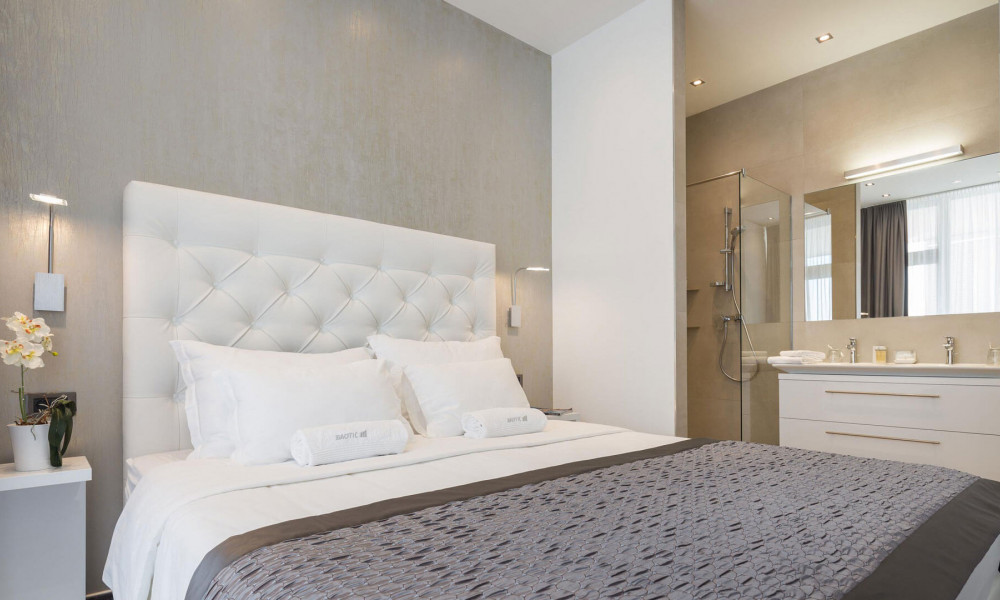 Dvije spavaće sobe s King Size krevetima, dvije kupaonice s toaletom i tuš kabinom. Uključena kuhinja, prostor za blagovanje, te dnevni boravak s kaučem na razvlačenje, klima uređajem, balkonom i ležaljkama za sunčanje.