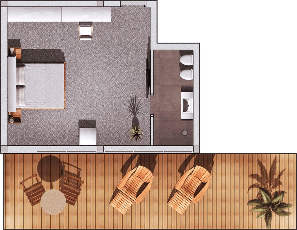 Spavaća soba s King Size krevetom, jedna kupaonica s toaletom i tuš kabinom. Uključen klima uređaj uz balkon i ležaljke za sunčanje.