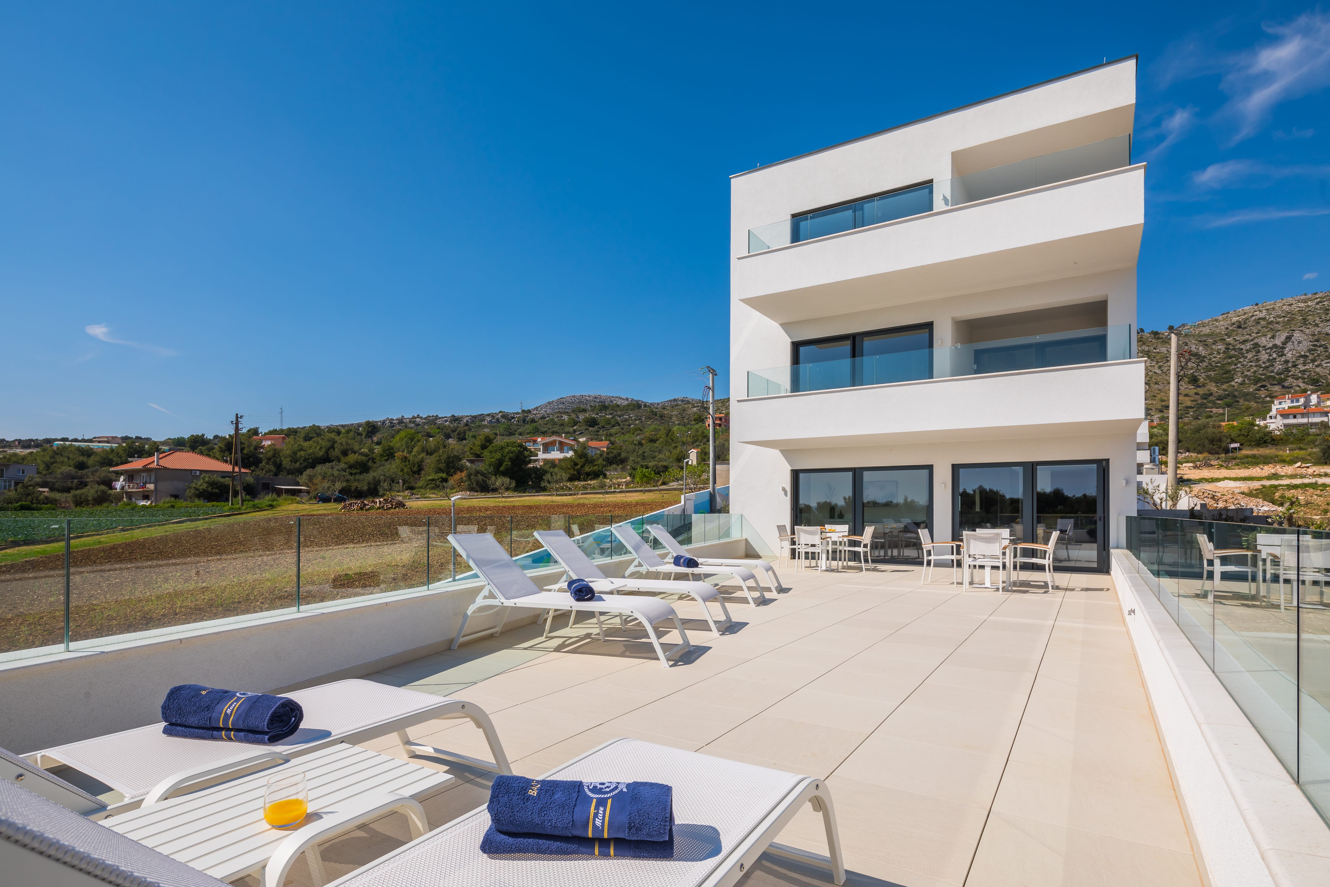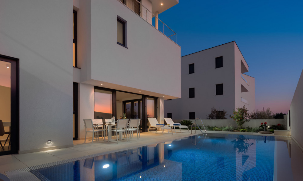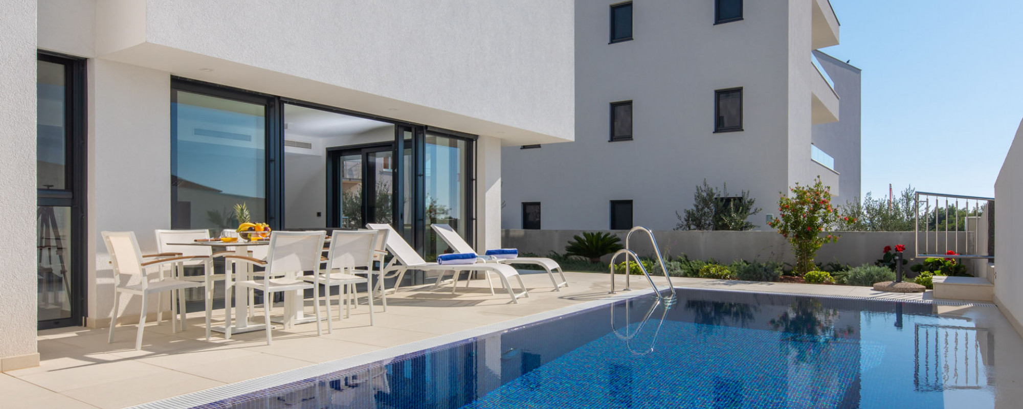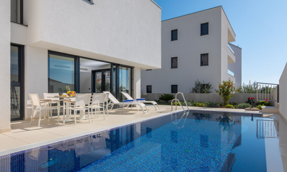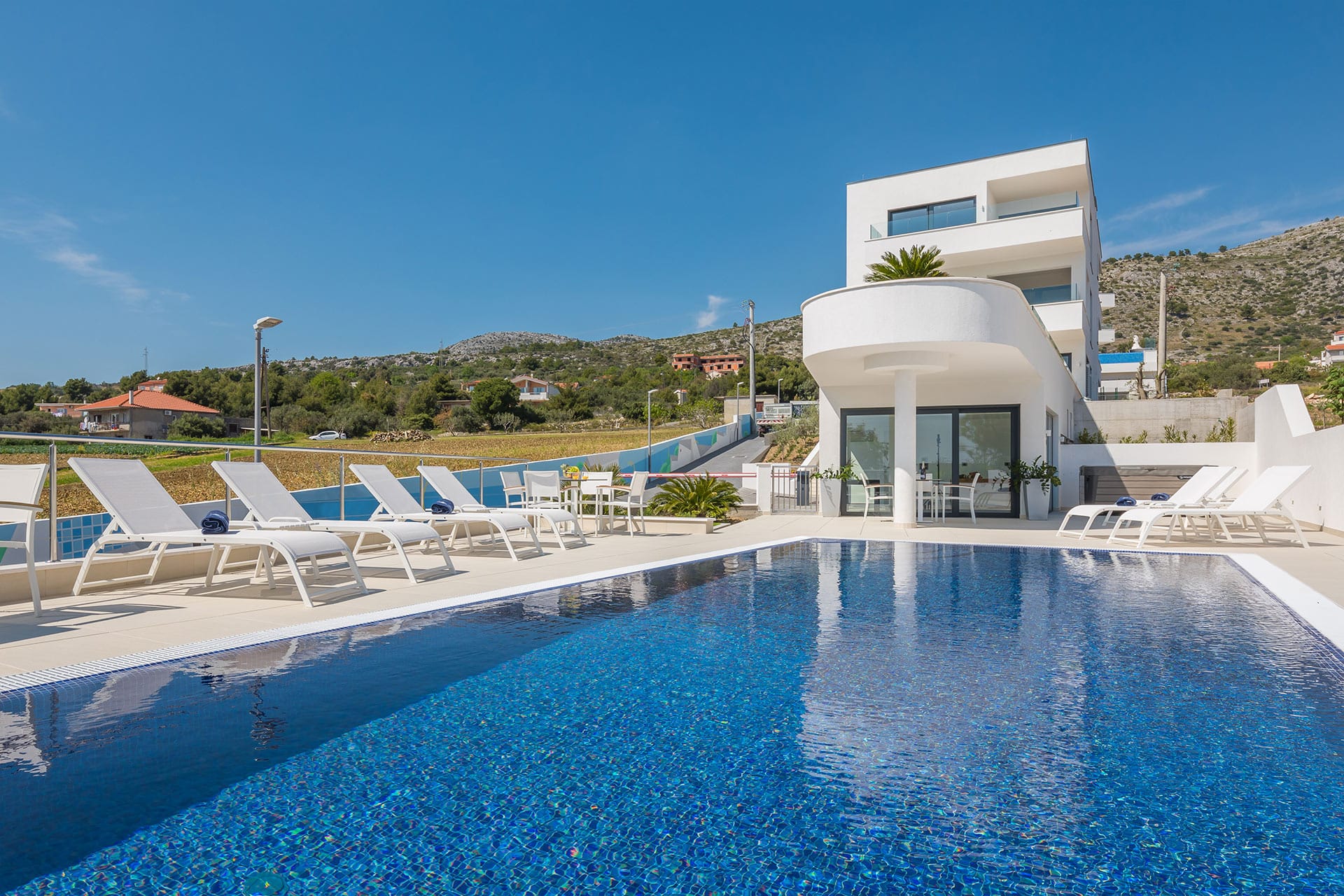 Vila s 3 spavaće sobe, King-size krevetom, 3 kupaonice, kuhinjom, blagovaonicom, balkonom terasom sa ležaljkama i privatnim grijanim bazenom.